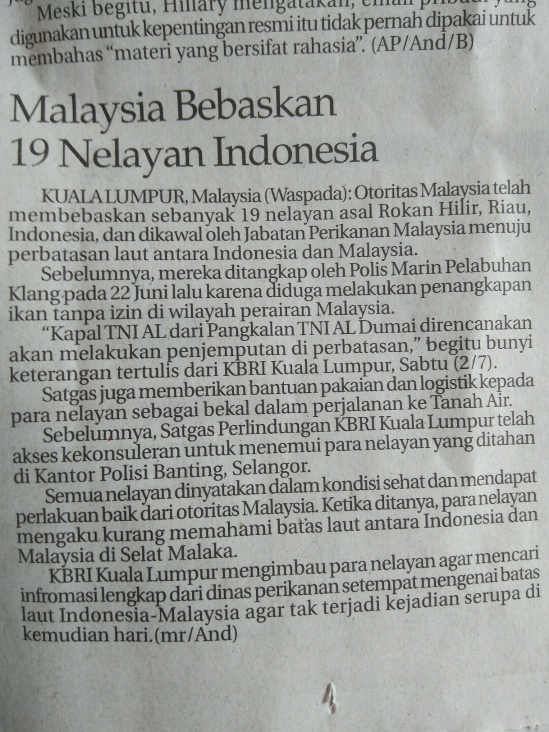 19 orang nelayan Indonesia yang disyaki menceroboh perairan Malaysia untuk menangkap ikan pada 22 Jun yang lalu dibebaskan oleh pihak berkuasa Malaysia.